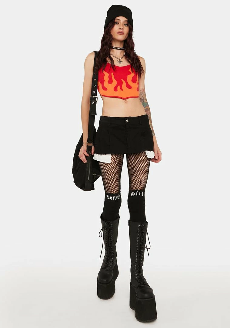 got you playin’ with fire! This cropped tank top has a comfortable knit construction, flames printed at front, and adjustable halter and back ties.
