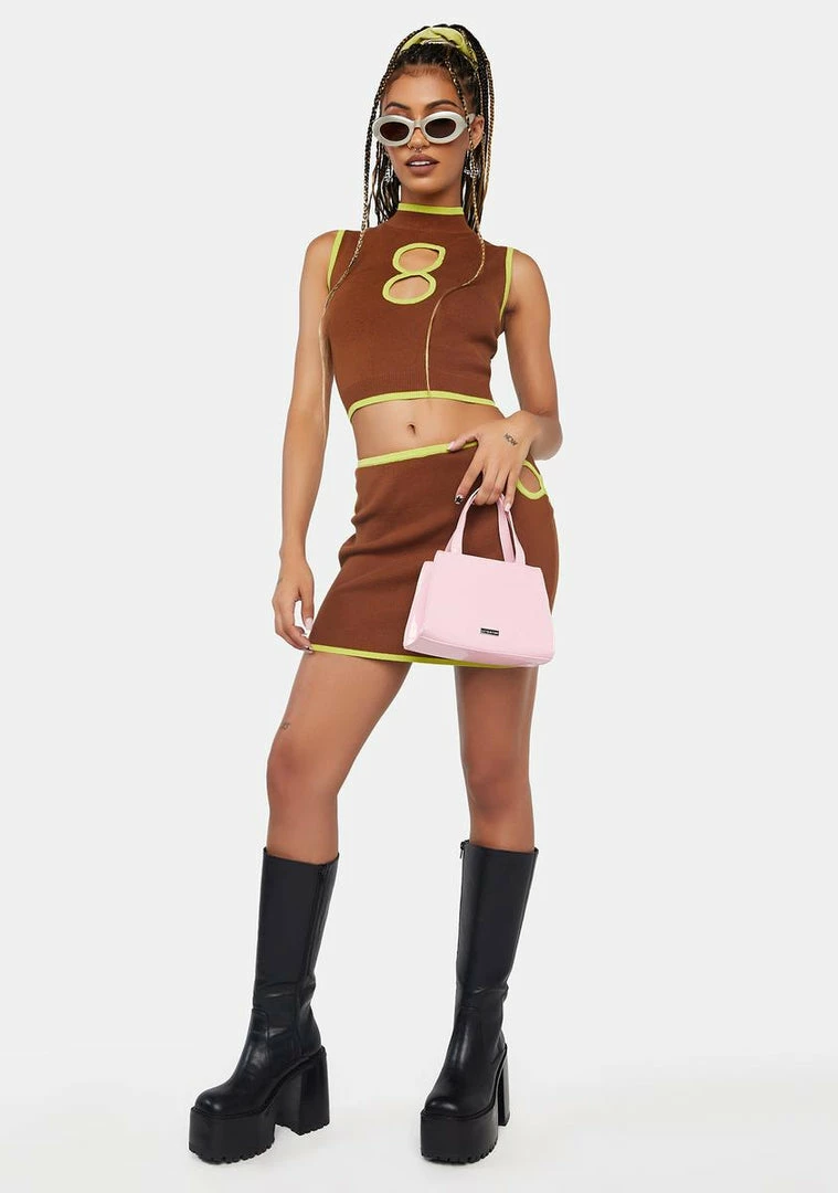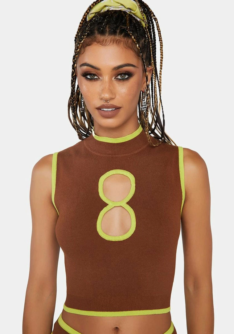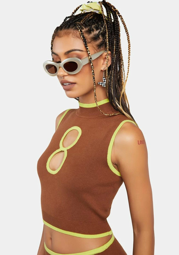 cuz you’re matchy-matchy. This crop top has a stretchy knit construction, circular chest cutouts, and contrast-colored trim.
