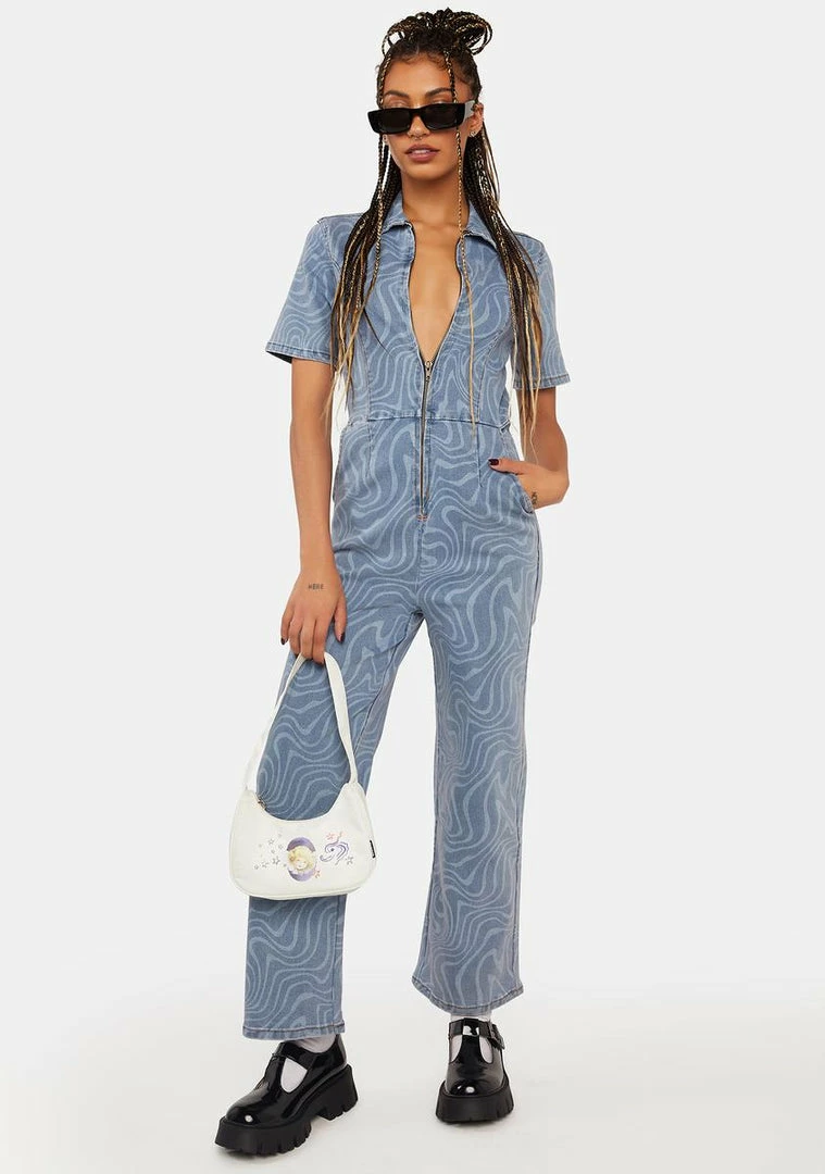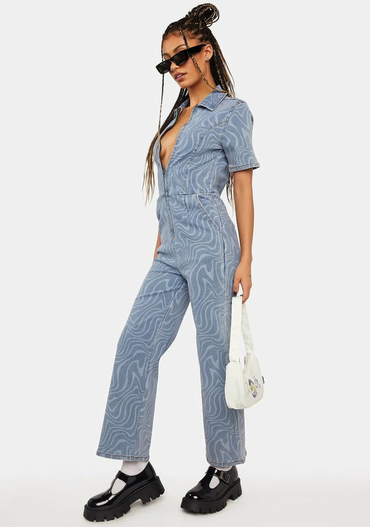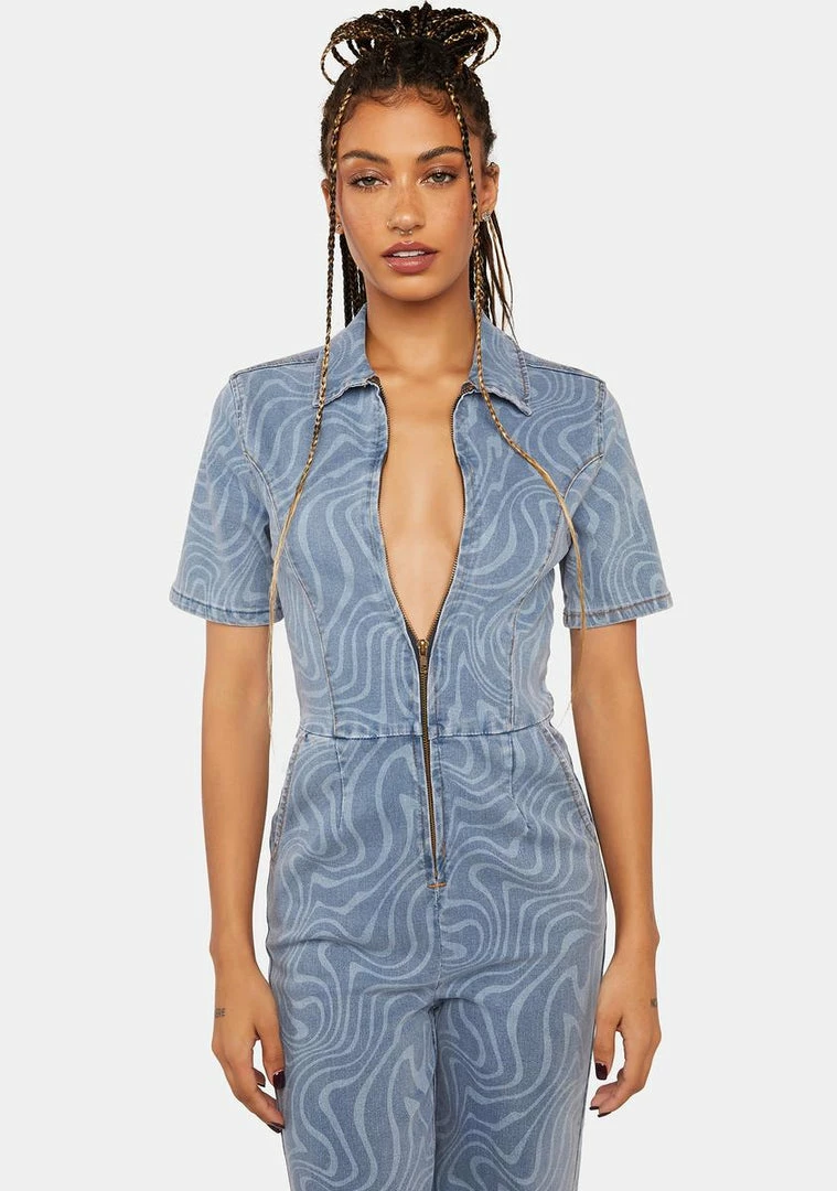 cuz you dare to be different. This jumpsuit has a denim construction, an all over trippy swirl print, a collared neckline, short sleeves, a flared leg silhouette, and a front zipper closure.