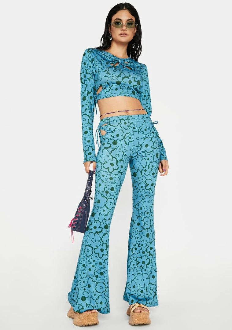 cuz you’re feeling the blues. These pants come in a high waist, flared fit, with side keyhole cut outs and tie closures, and a flower print all over.