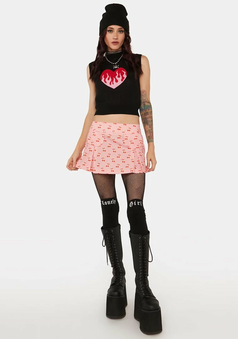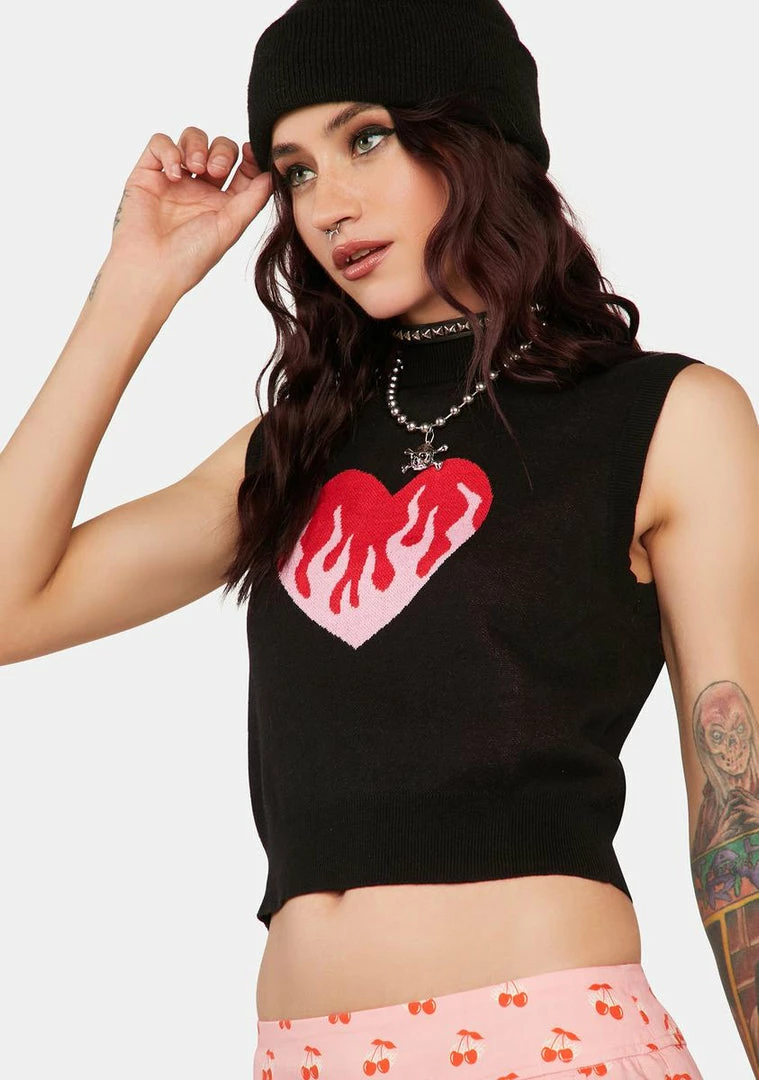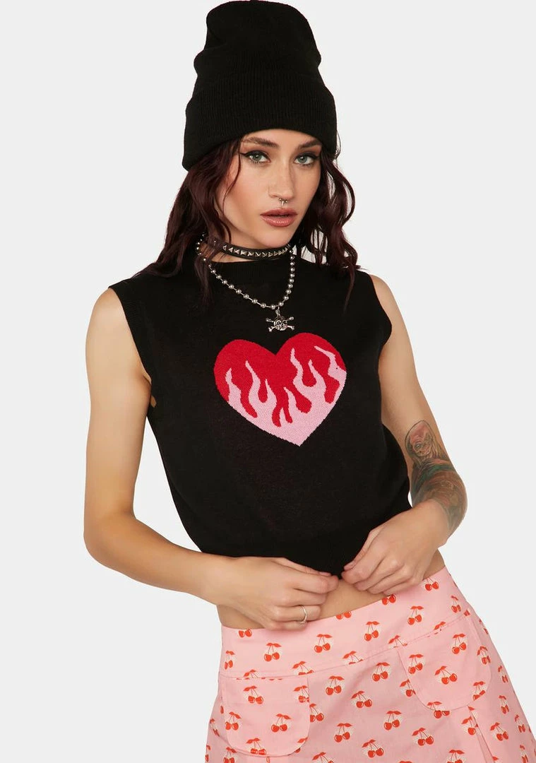 got you playin’ with fire! This cropped vest top has a flaming heart printed at front, a cozy knit construction, and a ribbed neckline, hem, and armholes.