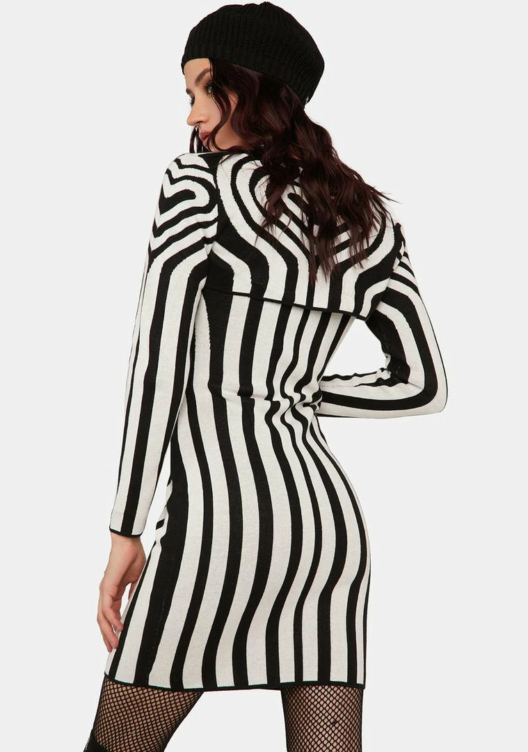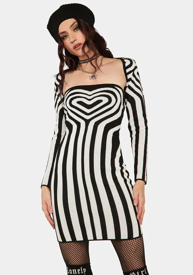 cuz you’re ready to fall in love. This mini dress has a comfortable and stretchy knit construction, a groovy contrast-colored heart and stripes printed all over, a square neckline, a capelet detail at back, and comes with a matching long-sleeved shrug.