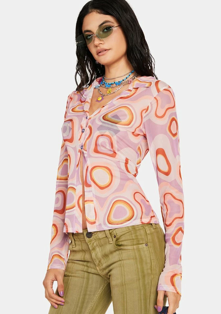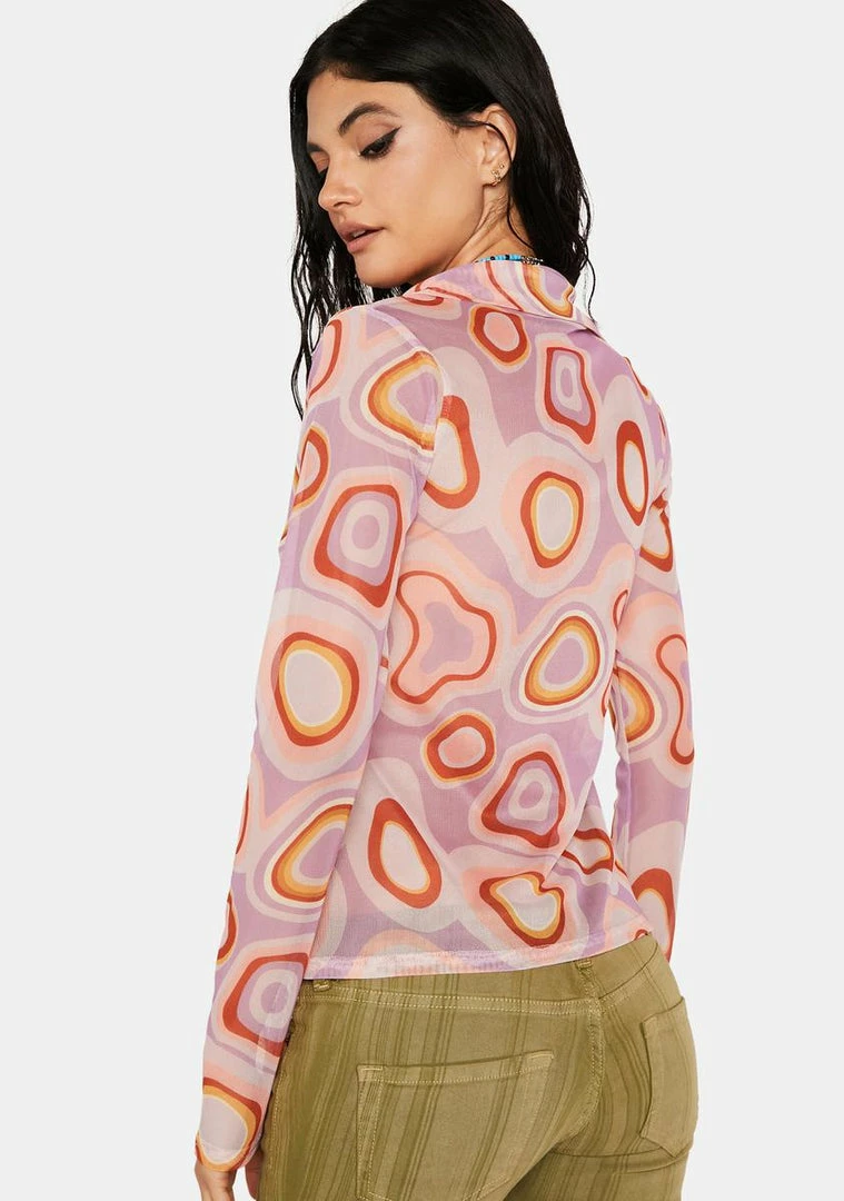 cuz you hypnotize me. This shirt comes in a mesh construction, with a button up front closure, collared neckline, long sleeves, and a groovy circle pattern all over.