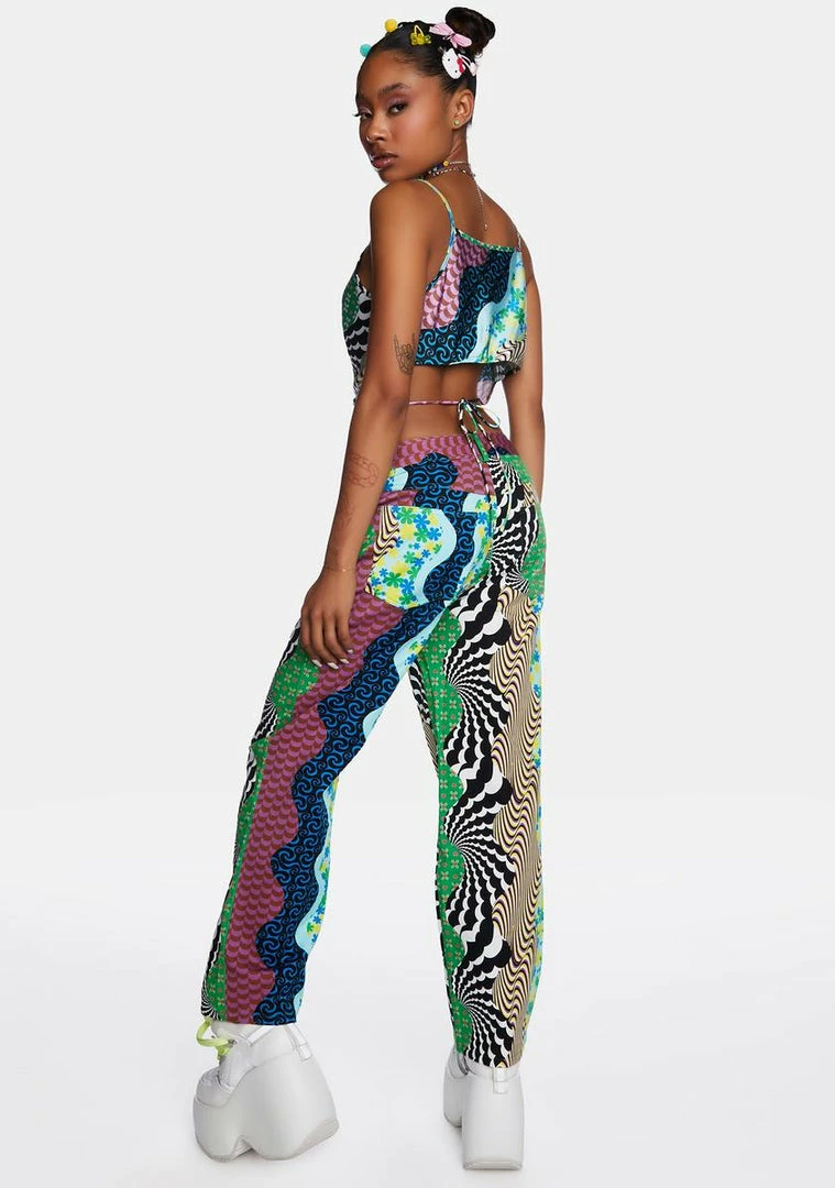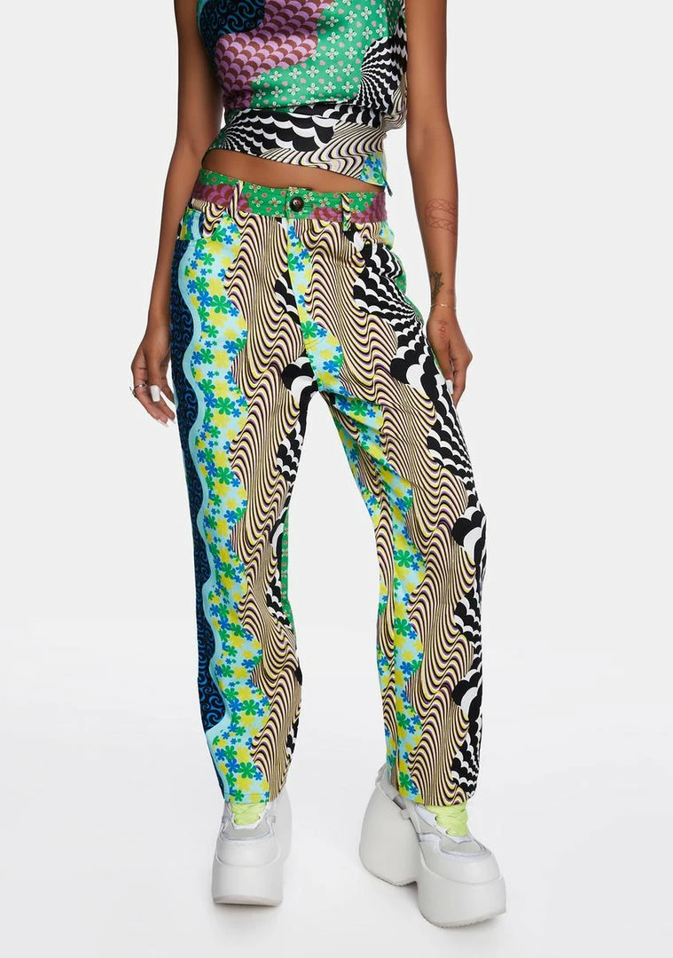 show ’em how it’s done. These jeans come with a low waist, front and back pockets, straight leg, and mixed abstract print all over.