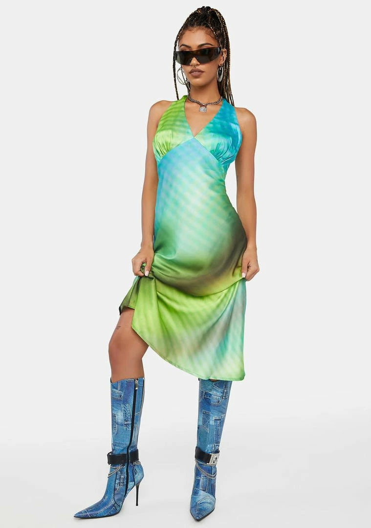 cuz all you need is a splash of color. This midi dress has a trippy striped tie-dye print all over, a V-neckline, an open back with crisscross straps, and a back zip closure.