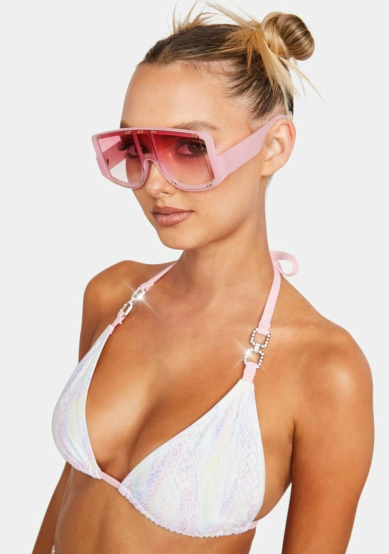 give ’em poison paradise! This pastel snake print bikini top has adjustable cups, rhinestone hardware details, tie back halter strap closures, and a plunging neckline.