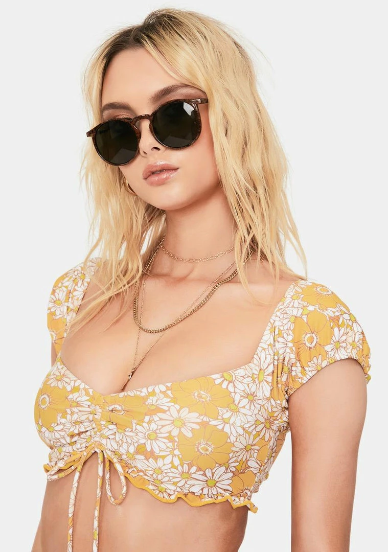 cuz youΓ’ΒΒre a ray of sunshine! This peasant style bikini top has cap sleeves, a ruched front seam with adjustable drawstrings, ruffle trim, a lace-up back, and a daisy print all over.