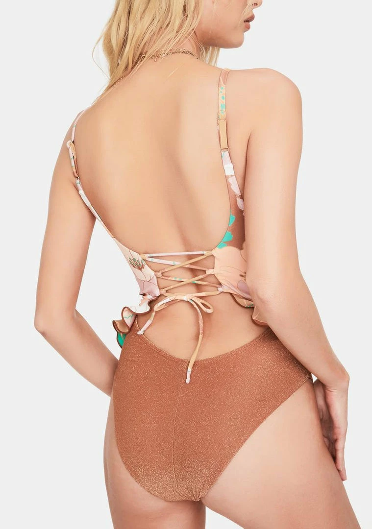 cuz youΓ’ΒΒre a ray of sunshine! This cutout one-piece swimsuit has a knotted front with ruffle trim, adjustable shoulder straps, a lace-up back, and a floral print top half.
