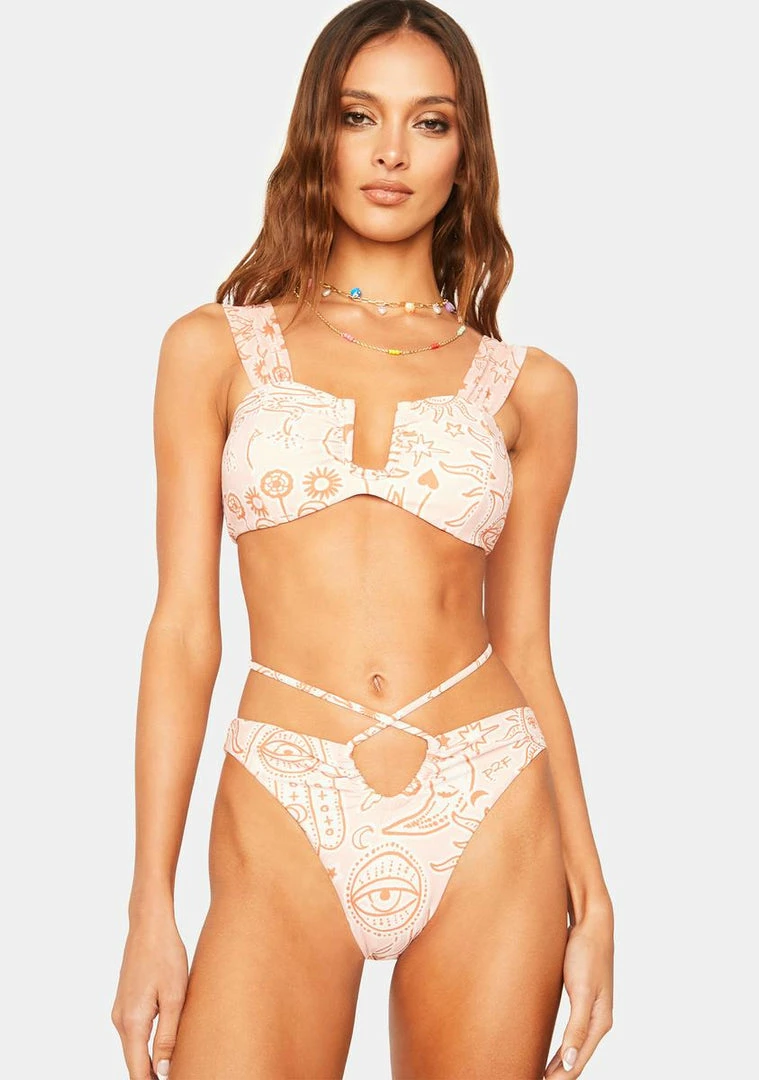 cuz you’re the sun and moon to them, babe! These strappy bikini bottoms have a high waist fit, a high leg cut, a keyhole front design, adjustable tie back closures, and a celestial print all over.