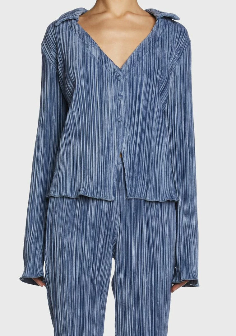 cuz you’re minimal chic. This button up shirt has a pleated construction all over, long sleeves, and a V-neckline.