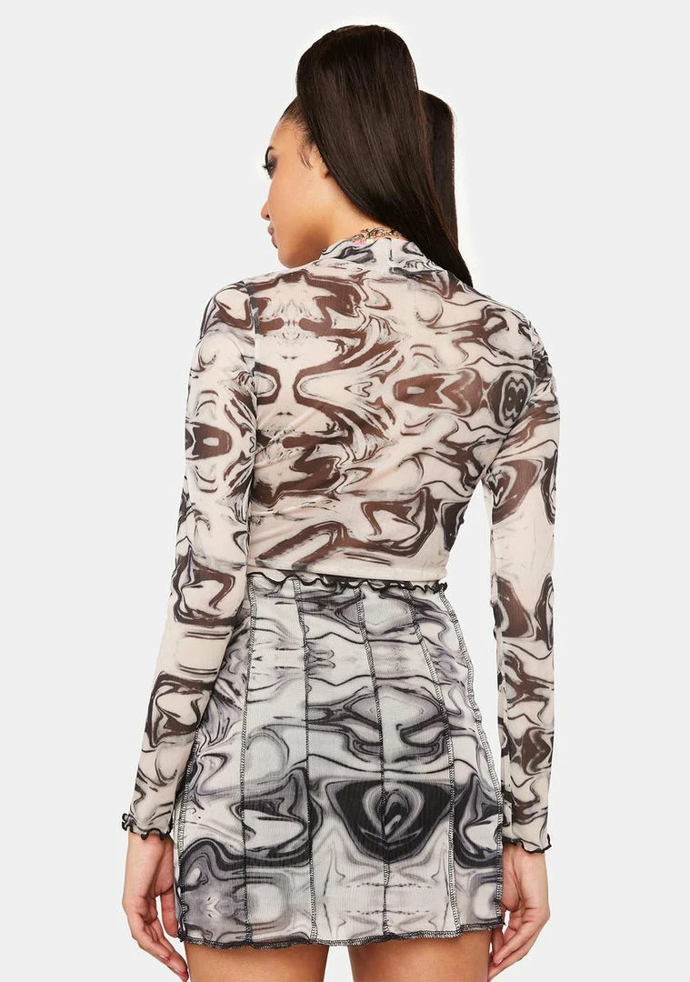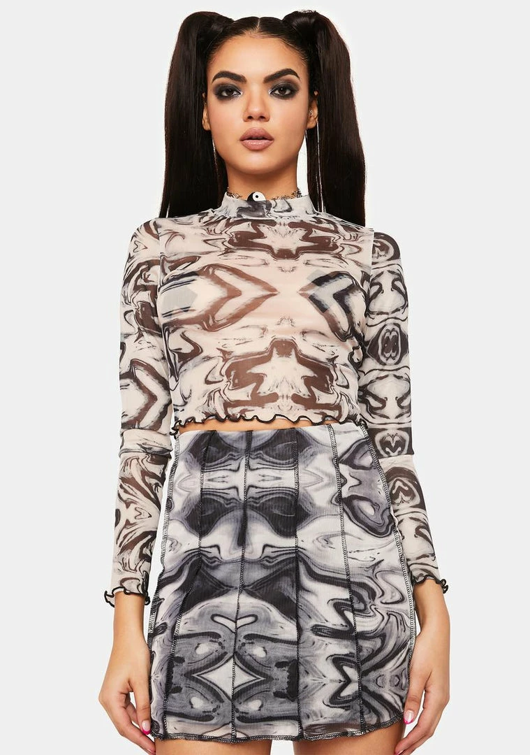 cuz you’re what it’s all about. This skirt has a swirl print, mesh construction, and exposed contrasting stitch detailing.