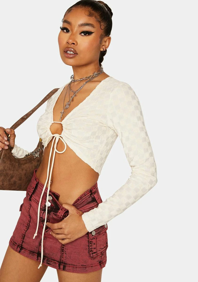 cuz you want it, you got it. Keep it real in this crop top that has a textured knit construction,a plunging neckline, ruched detailing with adjustable ties, long sleeves, and a checkered print all over.