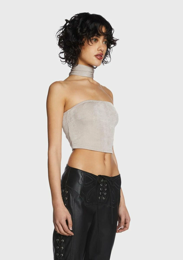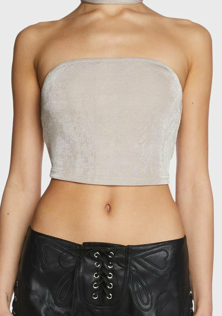 cuz you’re a real baddie. This tube top has a velour construction and a halter neckline with a choker detail.