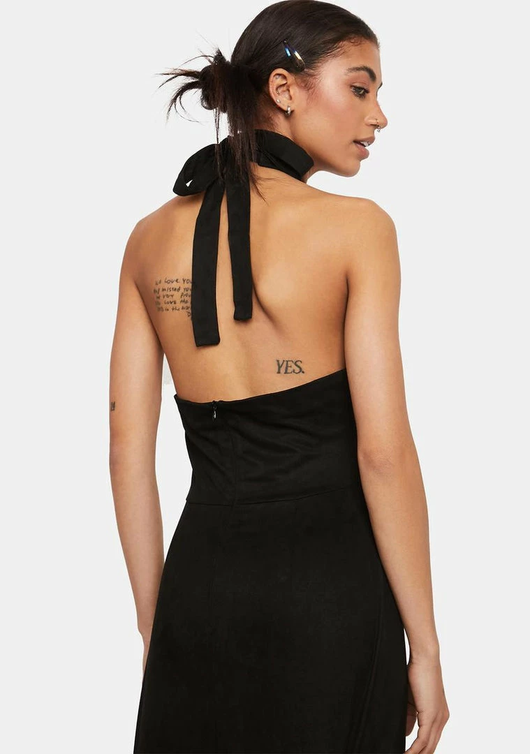 you know how to make an entrance. This faux suede mini dress comes in a bodycon fit, a halter tie top, and a large front cut out.