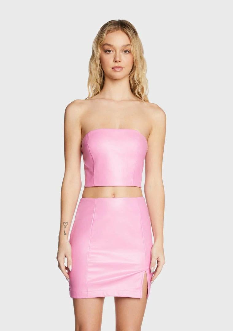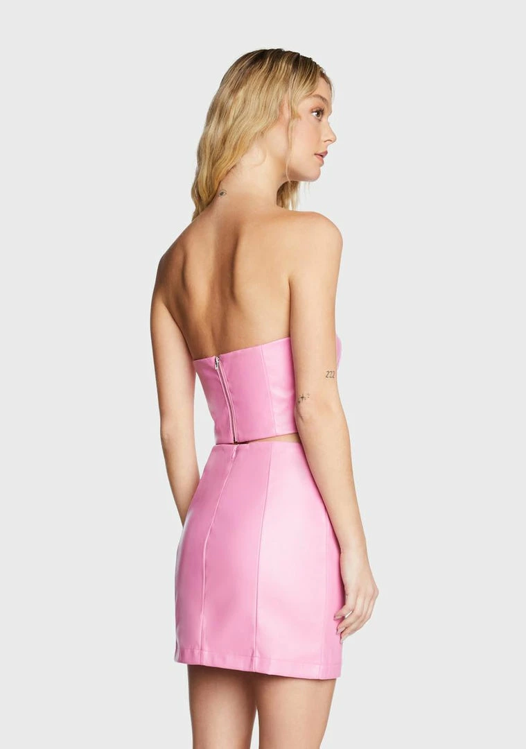 cuz you’re pretty in pink. This top comes in a cropped vegan leather construction, with a strapless fit, and a back zip closure.