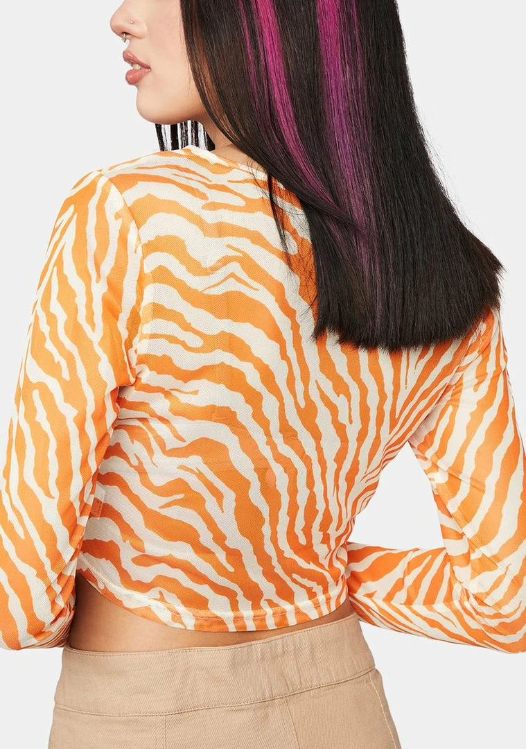 need you right meow. This top has a sheer mesh construction, a tiger stripe print, long sleeves with finger loops, and a cropped hem.