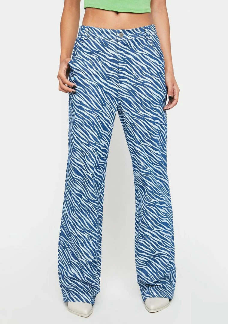 show them your stripes. These jeans come in a wide leg fit, with a button front closure, front and back pockets, and a zebra print all over.